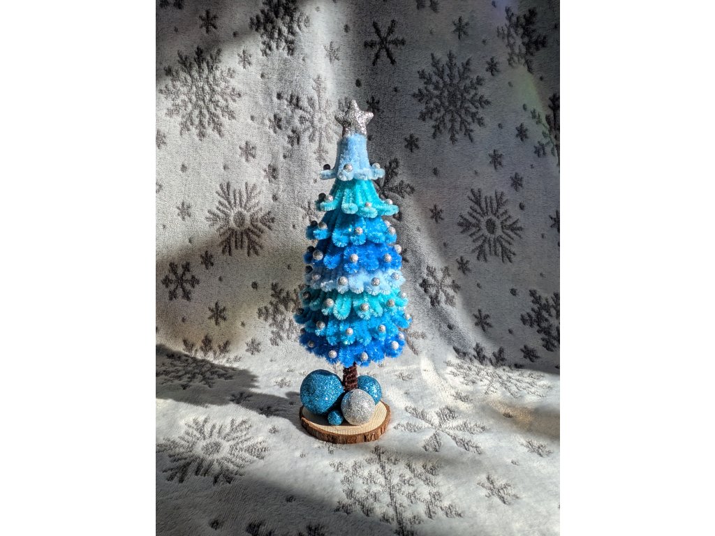 Stromeček je tvořený z chlupatých drátku a Vánočních dekorací, celý stromeček je lepený na přírodní dřevěné kolečko.