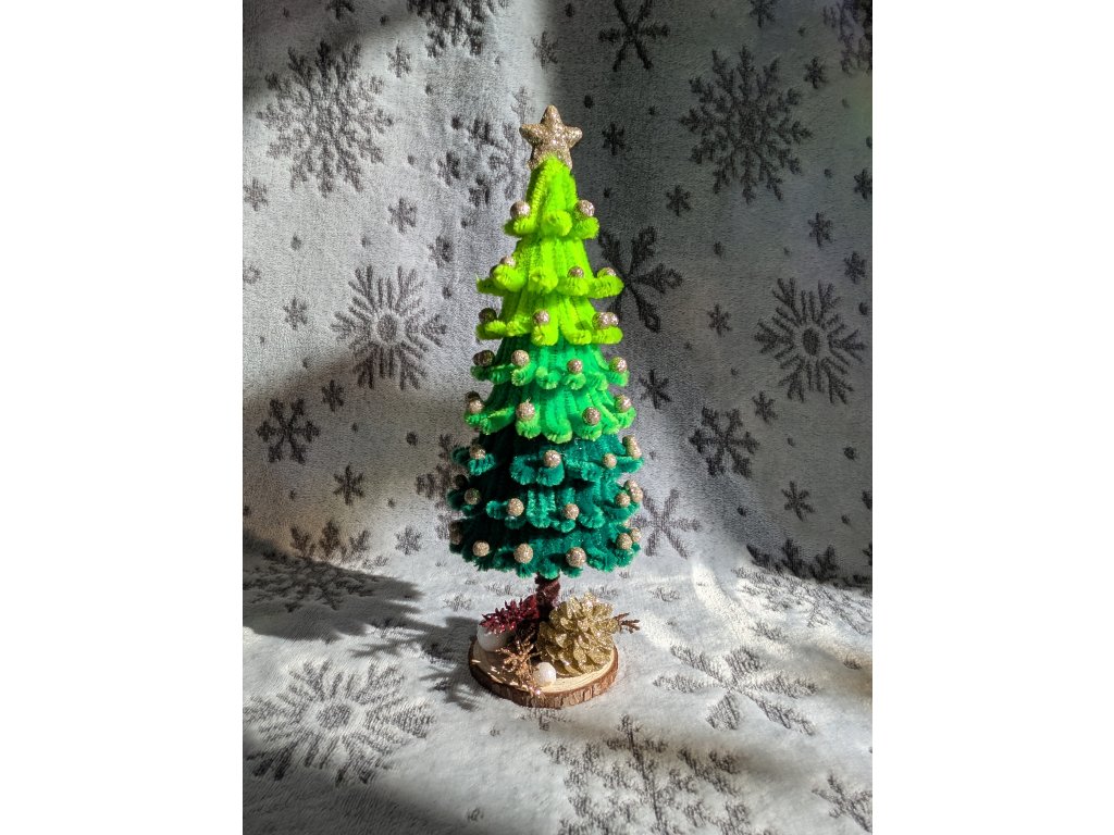 Stromeček je tvořený z chlupatých drátku a Vánočních dekorací, celý stromeček je lepený na přírodní dřevěné kolečko.